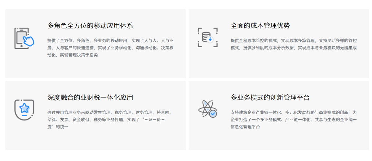 金蝶建筑企業(yè)數(shù)字化轉(zhuǎn)型解決方案,以項(xiàng)目管控、財(cái)務(wù)管控、資源管控、稅務(wù)管控四大企業(yè)核心管控要素出發(fā),融合項(xiàng)目管理、市場(chǎng)經(jīng)營(yíng)、財(cái)務(wù)、HR、OA供應(yīng)鏈、發(fā)票與稅務(wù)、CRM、BI、移動(dòng)應(yīng)用、第三方集成等多業(yè)務(wù)管理系統(tǒng),形成了建筑企業(yè)完整的、全面的、集成化、一體化的企業(yè)信息化管理平臺(tái),能有效地實(shí)現(xiàn)項(xiàng)目精細(xì)化管理、企業(yè)多業(yè)務(wù)模式管控、企業(yè)資源統(tǒng)籌與共享、業(yè)務(wù)財(cái)務(wù)資金預(yù)算稅務(wù)一體化等管理訴求。
